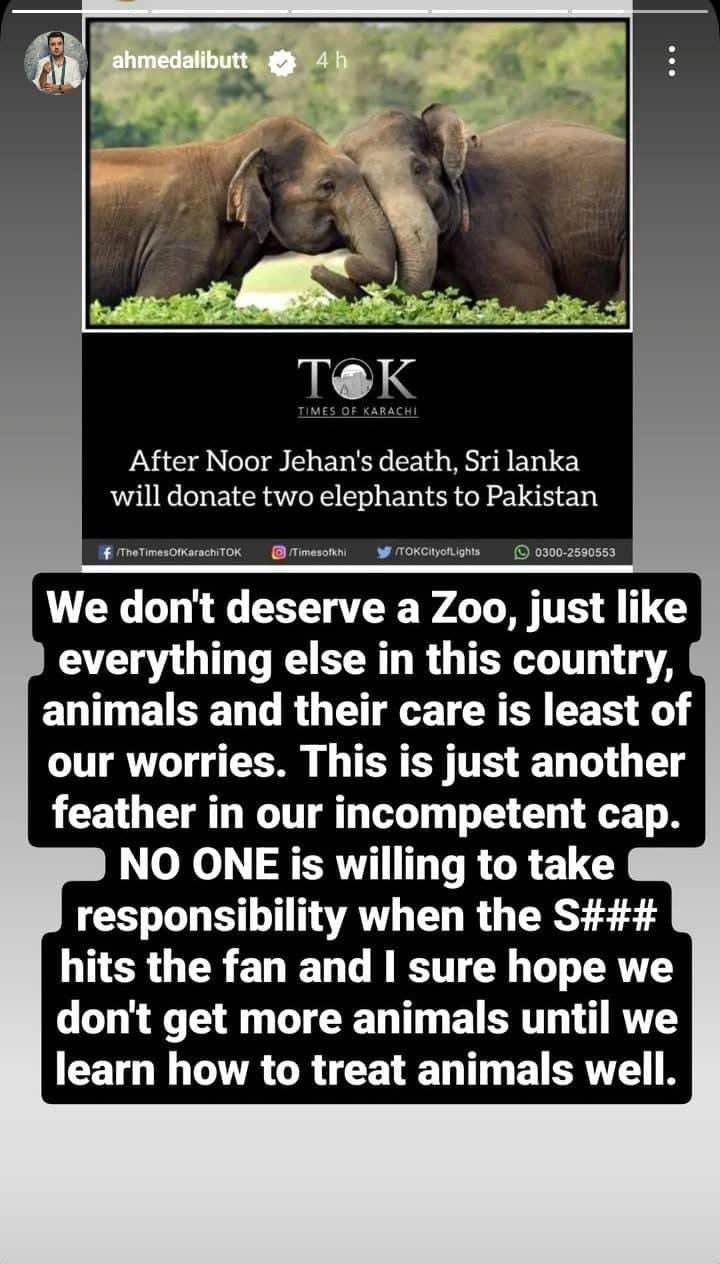 Other celebrities like Anushay Ashraf and Ahmed Ali Butt mourned the loss of Noor Jehan, and slammed the Karachi authorities for their limited resources which had led to the neglected conditions of animals at Karachi Zoo. In a now-expired post on her Instagram stories, Ashraf pointed out how zoos are not safe places for animals, and should not be entertainment facilities for humans: