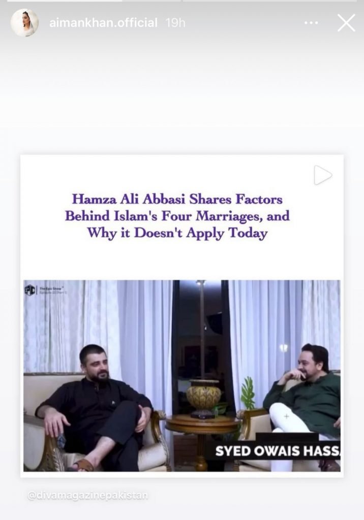 Aiman shared a clip of her Mann Mayal co-star on Instagram stories in which he was talking about his views on the four marriages in Islam.