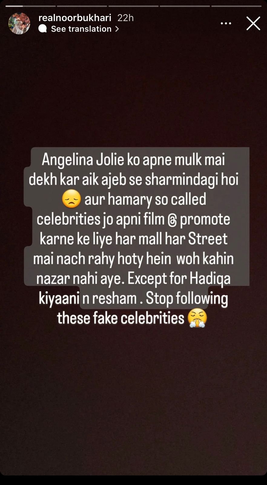 In an Instagram post, she shared pictures of several celebrities in Canada for the Hum TV Awards, along with an image of Hollywood actor Angelina Jolie in Pakistan.