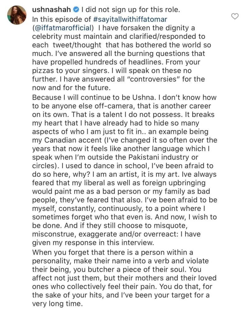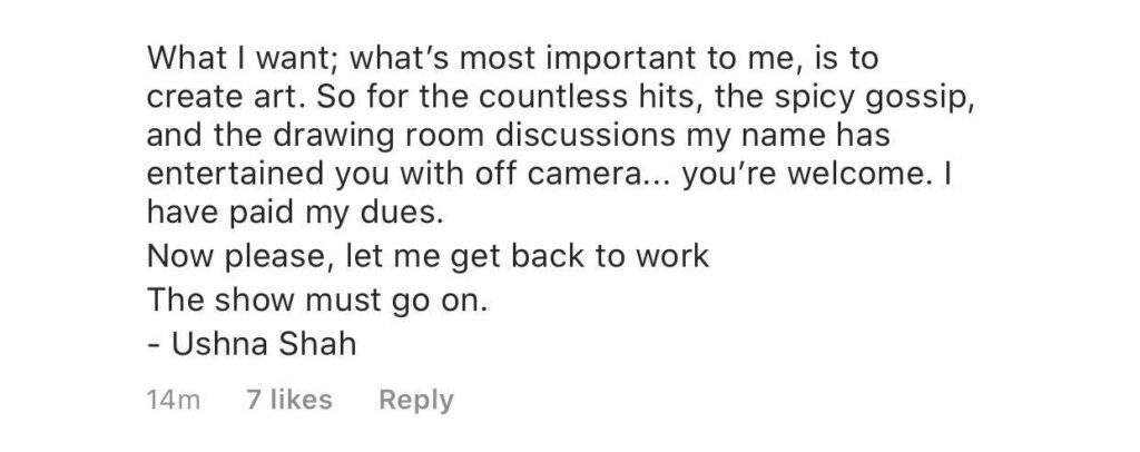 “What I want; what’s most important to me, is to create art. So for the countless hits, the spicy gossip, and the drawing-room discussions my name has entertained you with off-camera… you’re welcome. I have paid my dues, I’m bowing out of this circus,” wrote Ushna. “Now please, let me get back to work.”