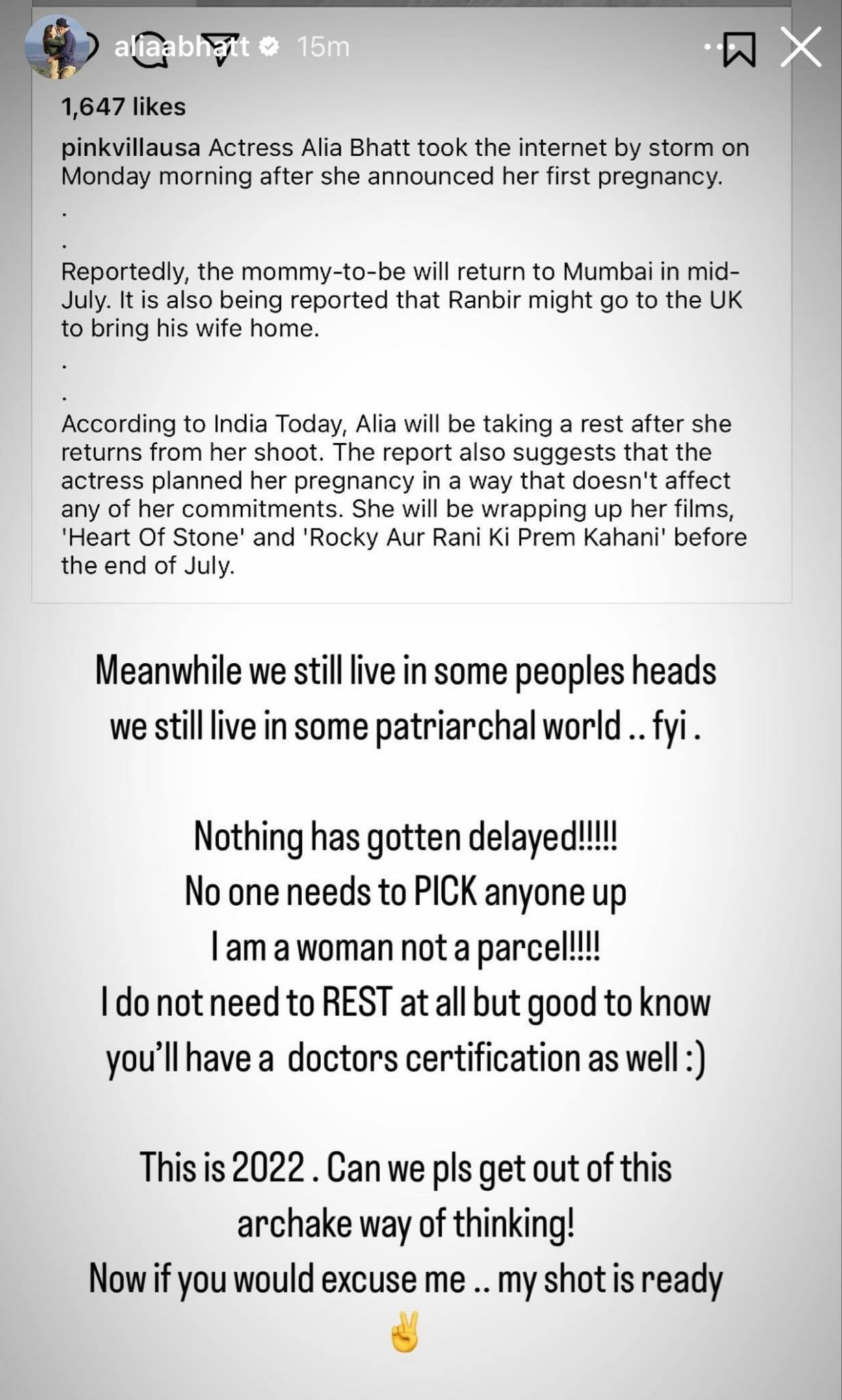 Alia captioned her post while re-sharing that in some “peoples heads we still live in some patriarchal world” and confirmed that nothing has been delayed. “No one needs to PICK anyone up. I am a woman, not a parcel!!!! I do not need to REST at all but good to know you’ll have a doctor’s certification as well.”