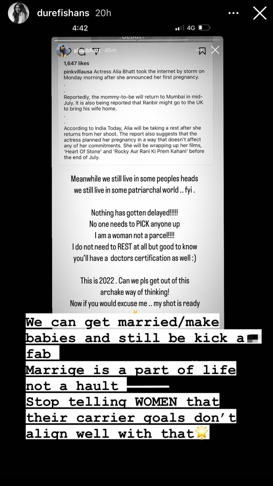 Kesi Teri Khudgarzi diva Dur-e-Fishan Saleem also shared Alia’s Instagram story to her own and wrote, “We can get married/make babies and still be kick a** fab. Marriage is a part of life not a [halt].” She also said people need to stop telling women that their career goals don’t align well with that.
