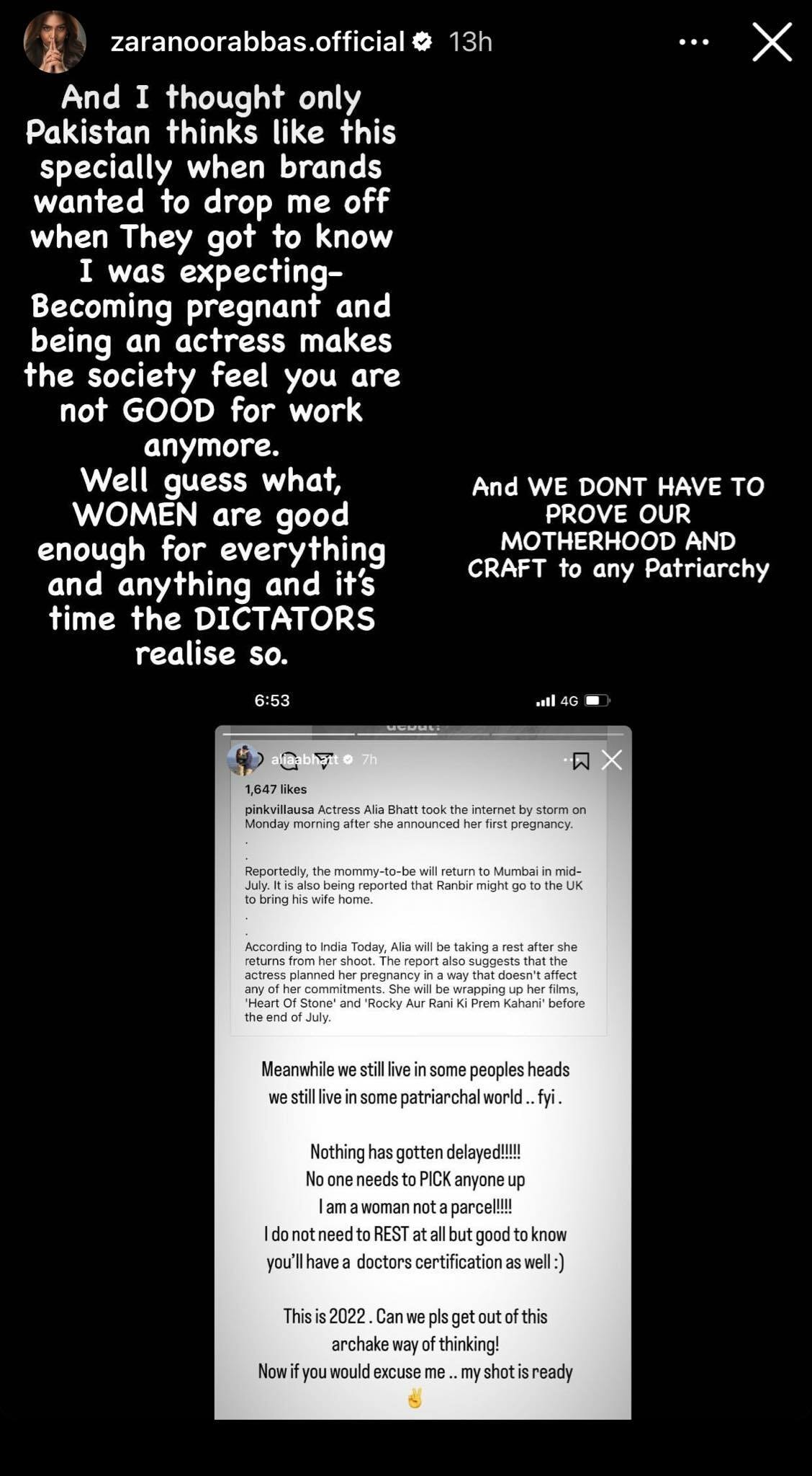 “Becoming pregnant and being an actress makes the society feel you are not good for work anymore. Well guess what, WOMEN are good enough for everything and anything and it’s time the dictators realise so. We don’t have to prove our motherhood and craft to any patriarchy,” penned the Zebaish star.