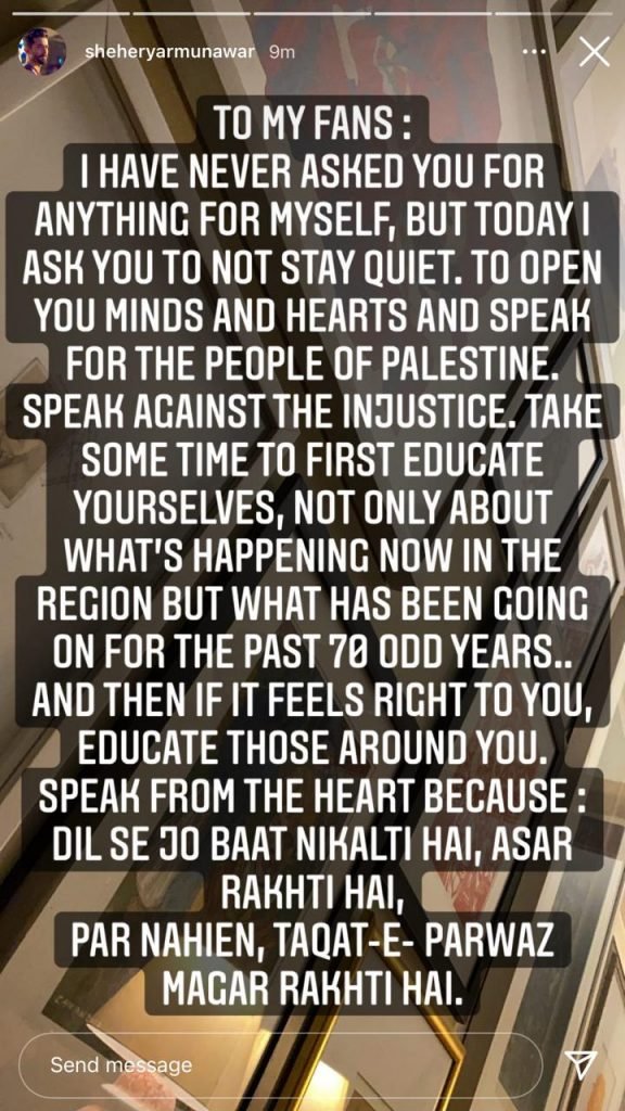 Sheheryar Munawar has urged his fans and followers to speak for the people of Palestine.