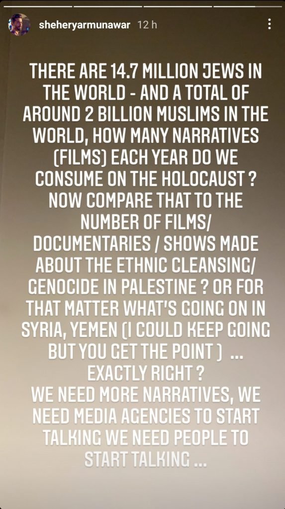 In another post, Sheheryar went on to say, “There are 14.7 million Jews in the world – and a total of around two billion Muslims in the world. How many narratives (films) each year do we consume on the holocaust? Now compare that to the number of films, documentaries, shows about the ethnic cleansing, genocide in Palestine? Or for that matter, what’s happening in Syria, Yemen (I could keep going but you get the point), exactly right?”