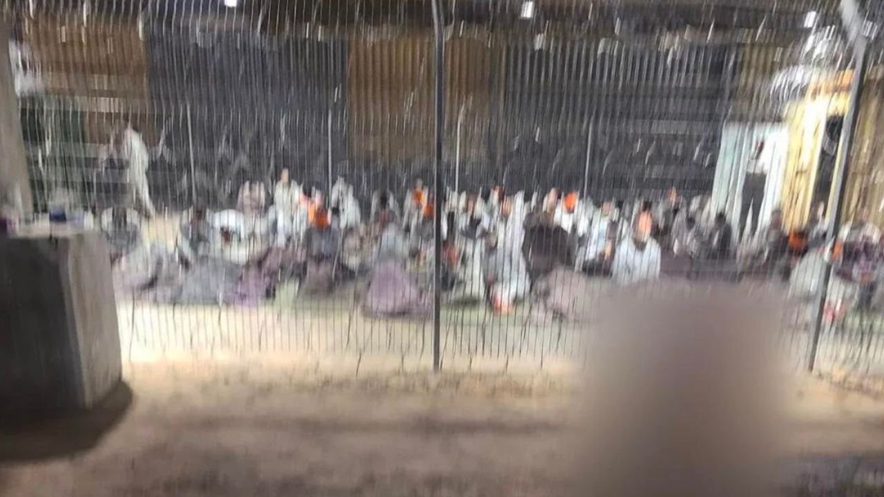 Picture showed rows of men in gray tracksuits sitting on paper-thin mattresses, ringfenced by barbed wire. The detainees were blindfolded, their heads hanging heavy under the harsh glare of floodlights.