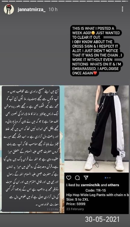 “To my Christian fans & friends, I am really sorry i didn’t notice the chain at all. I heartedly apologise to all of you. Please accept it,” said Jannat in her Instagram story.