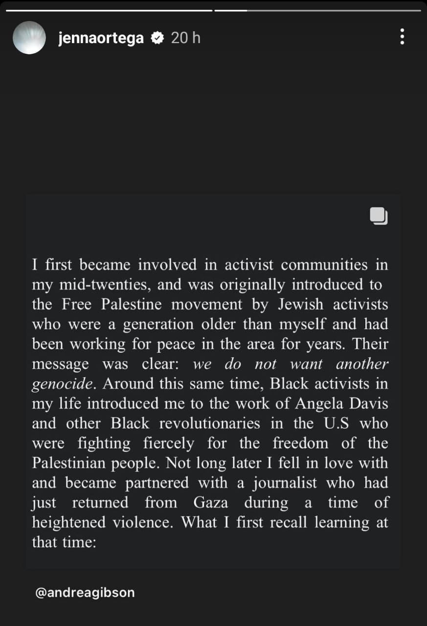 Hollywood actor Jenna Ortega, known for starring her role in the Netflix series ‘Wednesday,’ focused on the ongoing suffering of children in the genocide. In a post highlighting the harsh reality, she said, “People are arguing about a ceasefire while many children are still being killed. Where is the humanity?”