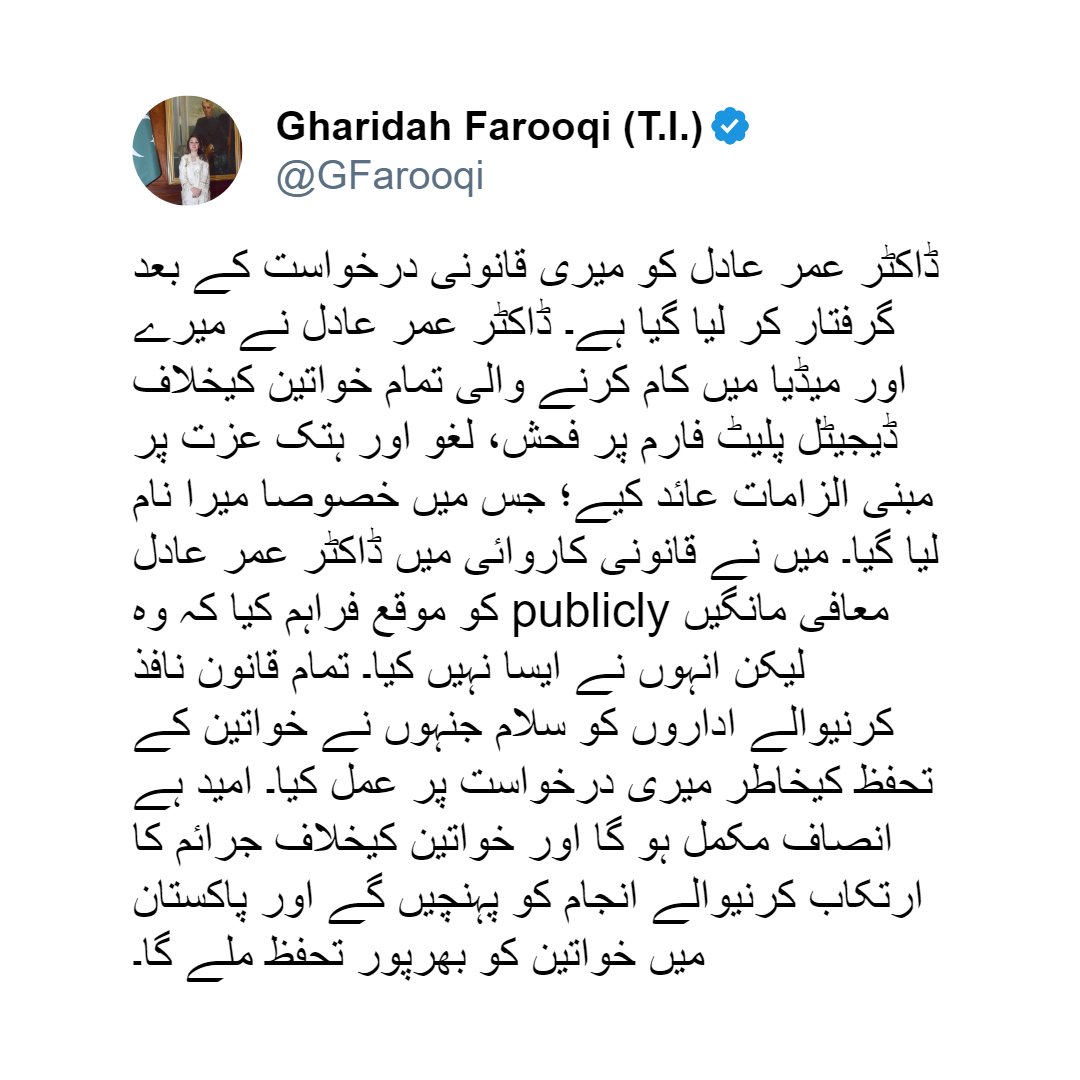 On August 24, Dr Omer Adil posted an “unconditional, wholehearted and sincere apology” to Gharidah Farooqi.