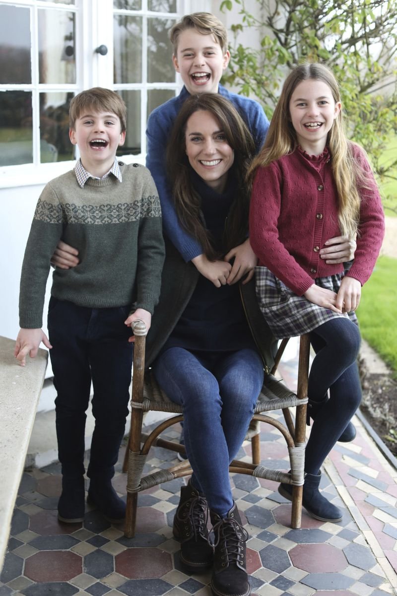 The photo shows the Princess of Wales sitting on a garden chair, dressed in jeans, a sweater and a dark jacket, smiling, surrounded by her three laughing children, George, Charlotte and Louis.