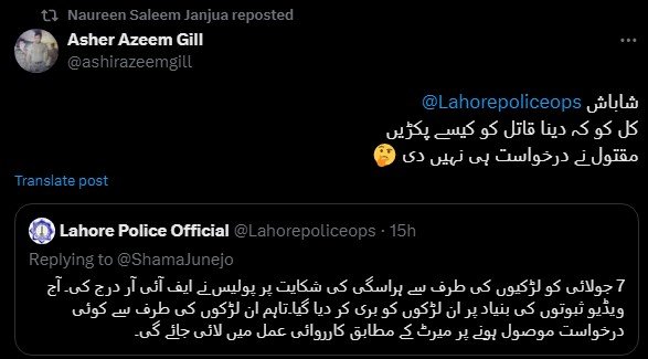 Netizens criticised Lahore police for this response as Ashir Azeem Gill, an ex-civil servant, actor and activist sarcastically wrote, “Well Done, Lahore police. Tomorrow you’ll say, how can we catch the killer, the deceased hasn’t filed a case.”