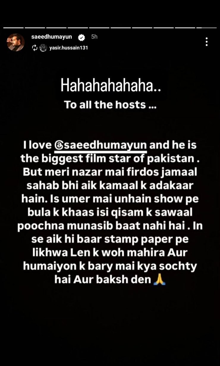 Renowned actor Humayun Saeed has responded to veteran actor Firdous Jamal’s negative comments about him. Humayun Saeed agreed with Yasir Hussain’s Instagram story, where Yasir advised hosts to stop asking controversial questions.