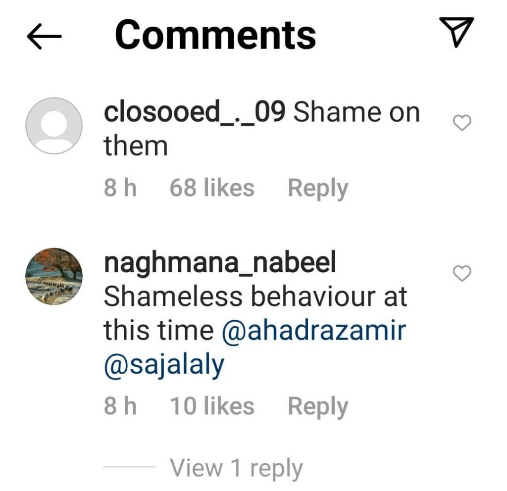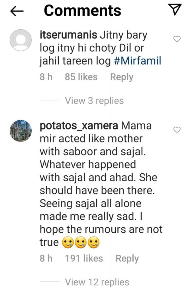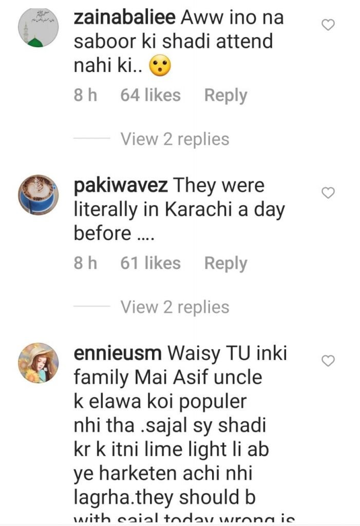 The speculation got fueled by the couple’s silence on the matter. The netizens have now expressed their displeasure at Ahad getting spotted in Dubai at a wedding instead of Saboor’s events.