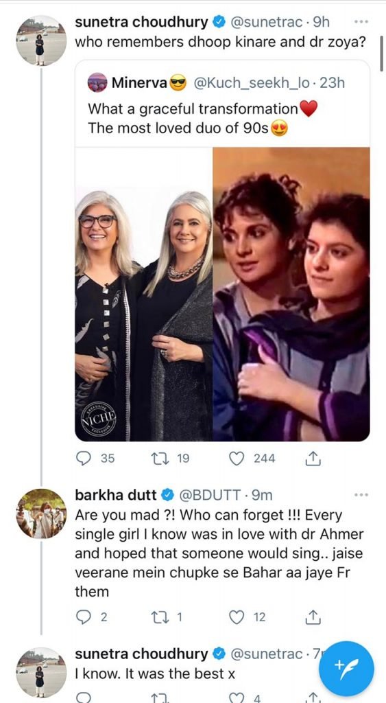 Sharing a collage of the veteran actresses on Twitter, Barkha wrote: “Gosh . Dhoop kinare and Tanhaiyaan. I would watch DK before every school exam, crushed on Dr Ahmer before wuthering heights made the Heathcliffe sort trendy and hoped someone would sing me faiz some day. Are we that old?”