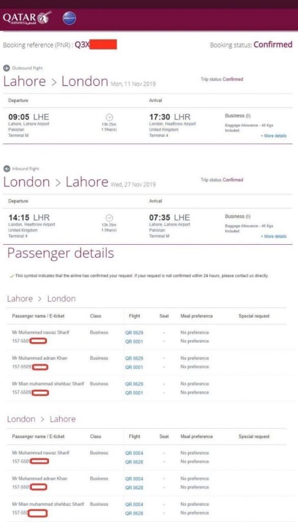 According to the tickets booked in his name, Sharif will be flying out from Lahore on a commercial flight of Qatar Airways and 09:05 am in the morning. He will be accompanied by his brother Shehbaz Sharif and his personal doctor Dr Adnan Khan.