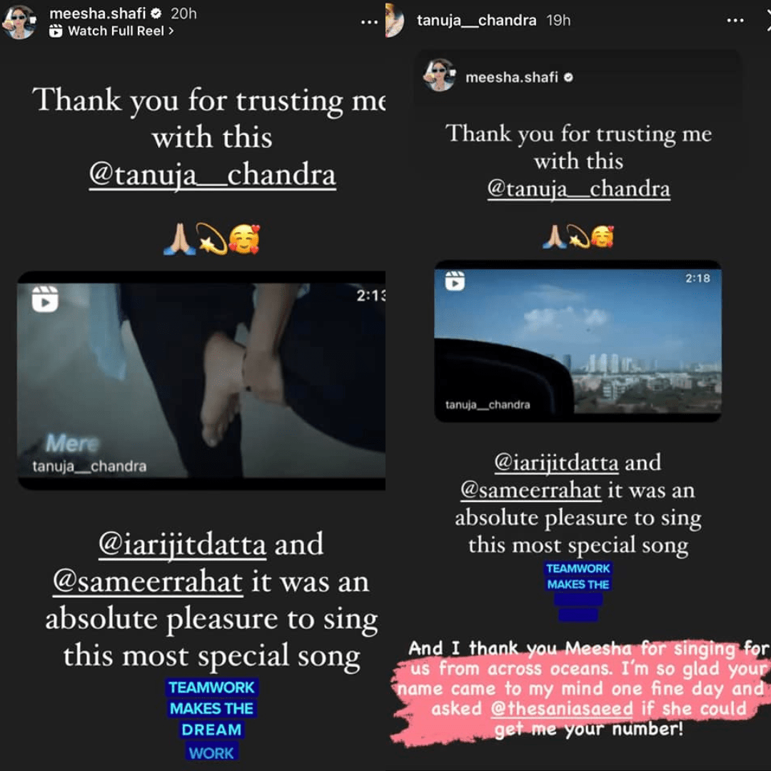 Chandra re-shared her Instagram story and thanked Shafi for singing for them “from across oceans”. She also expressed that she’s glad Shafi came to her mind after she spoke with actor Sania Saeed and asked if she could get her the ‘Muaziz Saarif’ singer’s contact details.