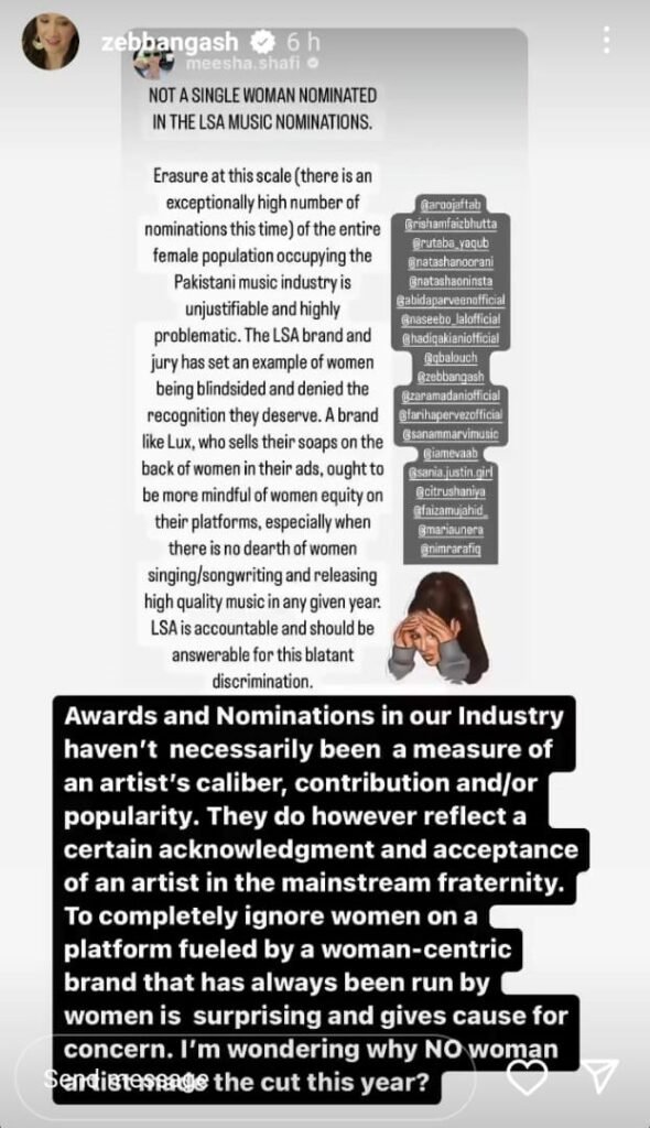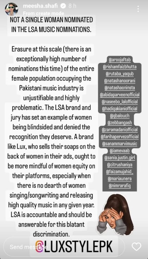 The veteran singer took to her instagram stories to state, “Not a single woman nominated in the LSA music nominations. Erasure at this scale (there is an exceptionally high number of nominations this time) of the entire female population occupying the Pakistani music industry is unjustifiable and highly problematic.”