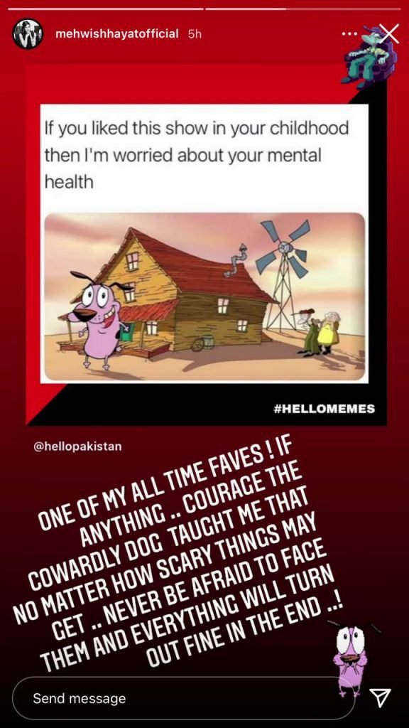 “One of my all time faves,” said Mehwish in an Instagram story. “If anything…Courage The Cowardly Dog taught me that no matter how scary things may get, never be afraid to face them and everything will turn out fine in the end.”