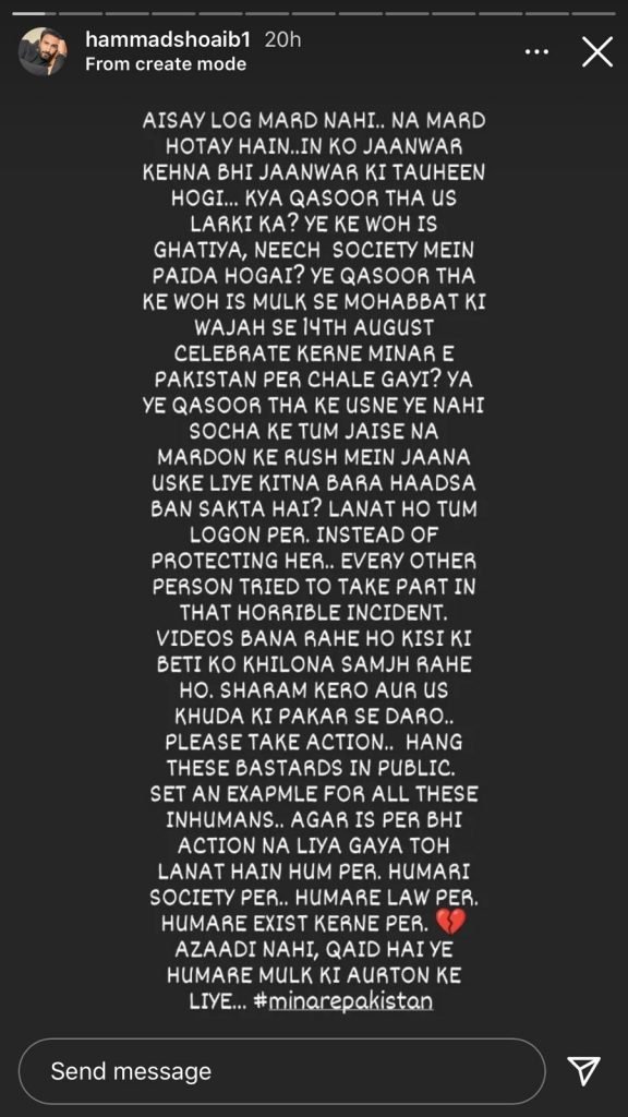 On August 14, a female TikToker was sexually assaulted and harassed by hundreds of men at Minar-e-Pakistan in Lahore. An FIR has been registered. Prime Minister Imran Khan and Punjab Chief Minister Usman Buzdar have vowed to catch the culprits. But is this enough? No, it is not! A woman was groped, assaulted, harassed for more than two hours by 300-400 men and nobody could stop it. Let this sink in. Hundreds of men and more than two hours! Imagine her trauma, imagine her pain, imagine her helplessness, imagine how she has been scarred for life. We cannot even imagine what she must be going through and can only show solidarity with her by our words. The state has to act against the culprits who committed this heinous crime.