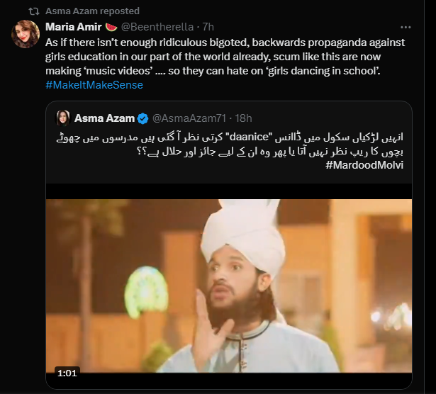 Another netizen, Maria Amir, wrote, “As if there isn’t enough ridiculous bigoted, backwards propaganda against girls education in our part of the world already, scum like this are now making ‘music videos’ …. so they can hate on ‘girls dancing in school.”