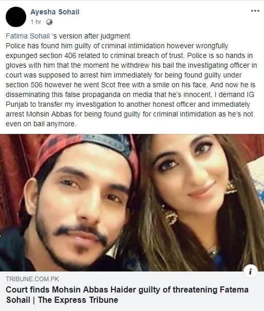 Fatema’s sister Ayesha took to social media to explain the victim’s version of the story. Ayesha claims that the police is supporting Mohsin.