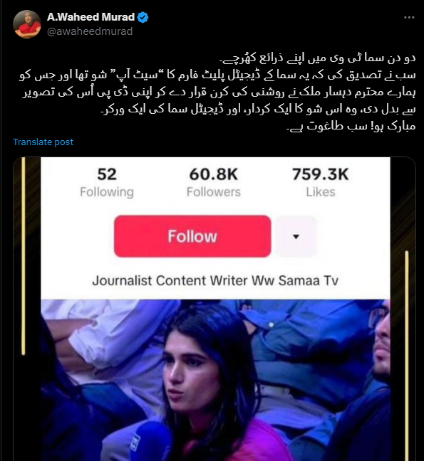 The statement prompted people to speculate whether the show was staged. Journalist Abdul Waheed Murad tweeted on X (formerly Twitter), claiming that the show was a “setup” and the woman was a worker at Samaa.