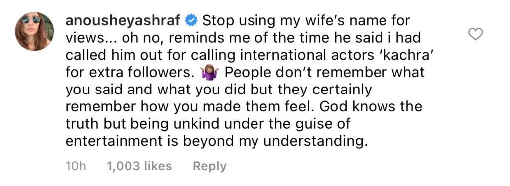 Anoushey Ashraf, who had earlier gotten into a spat with Yasir on social media, also lashed out at the actor, saying: “People don’t remember what you said and what you did but they certainly remember how you made them feel.”