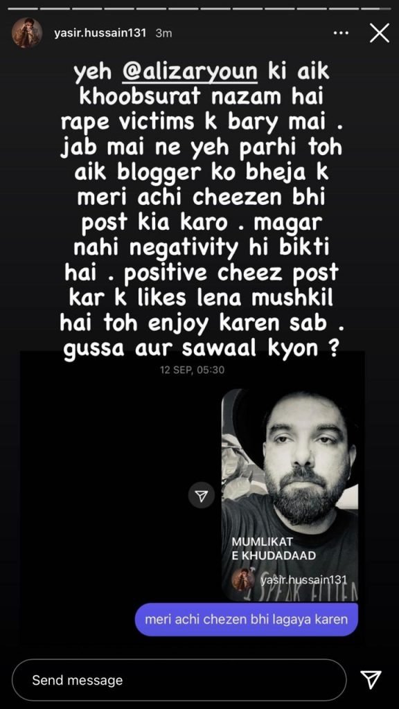 The actor further went on to say that he once requested a blogger to publish a poem on rape victims that he read, asking them to also post good things about him, “Magar nahi. Negativity hee bikti hai, positive cheez post kar k likes lena mushkil hai toh enjoy karen sab.”