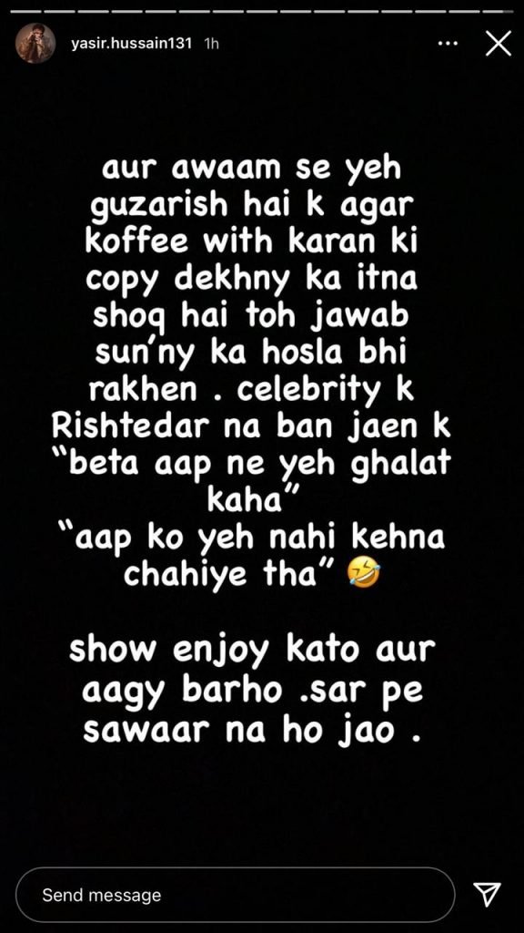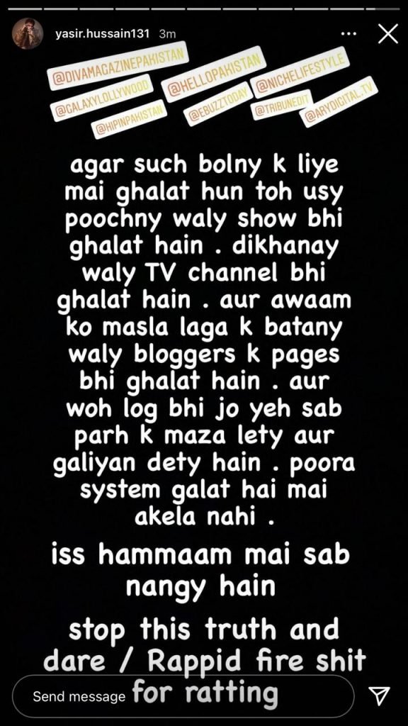 “Poora system ghalat hai mai akela nahi (the whole system is wrong and not just me alone),” said Yasir, adding that if audiences wanted to watch shows following the Koffee with Karan format, they needed to be able to bear with the answers as well.