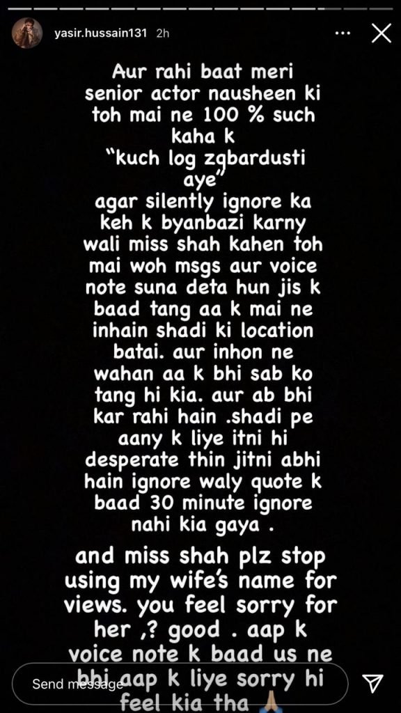 “I shared the truth about senior actor Nausheen ‘that some people came forcefully’,” wrote Yasir.