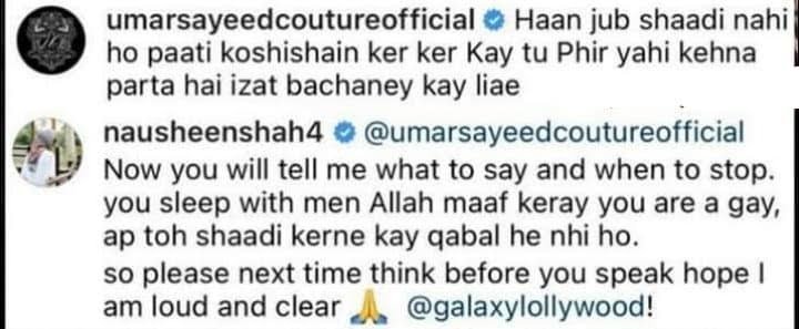 Nausheen Shah and designer Umer Sayeed got into an online fight after the former voiced her frustration over being constantly picked on for not getting married and the latter passed insensitive comments on her.