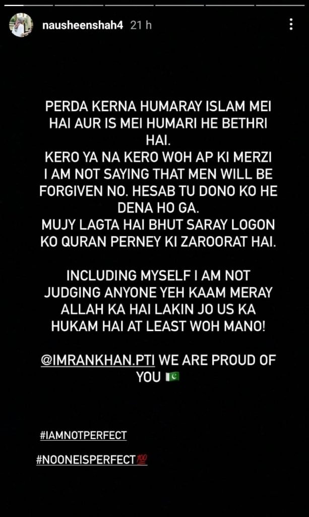 Taking to her Instagram stories, Shah said: “Perda kerna humaray Islam mei hai aur is mei humari he behtari hai.”