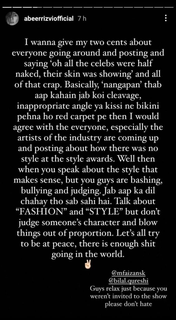 Raasta fame Abeer Rizvi has took to her Instagram handle to defend fellow female celebrities who have been a subject of cyber vilification for their choice of dressing at the 5th Hum Style Awards.