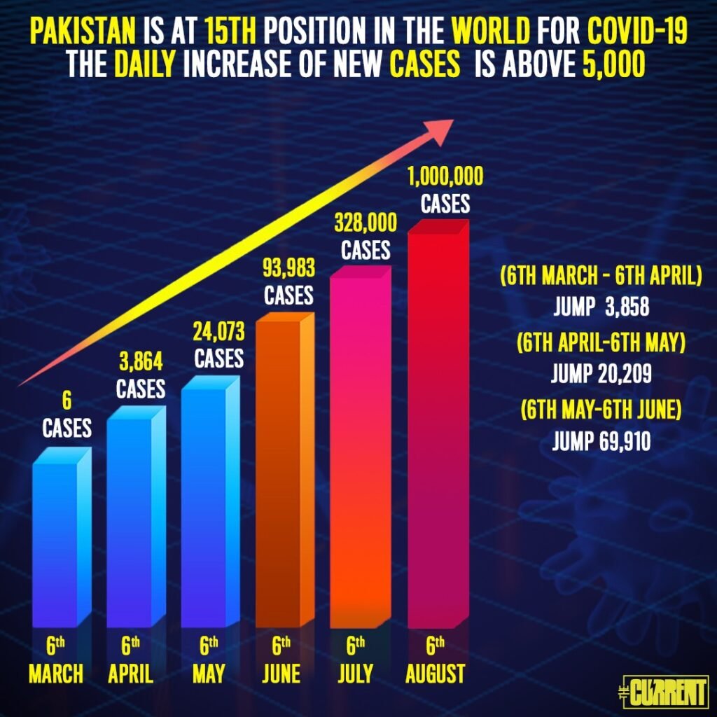 An analysis by The Current showed that before lockdown restrictions were eased in Pakistan ahead of Eidul Fitr, the highest number of confirmed coronavirus cases stood at 24,648 during the first week of May. The figure then crawled up to 122,574 by June 11, while the number of coronavirus cases as of this moment stands past 165,000 with thousands of cases being reported every day despite a low testing capacity.