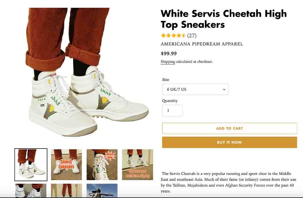 An American online shopping platform known as “Americana Pipedream” is offering Pakistani Servis Cheetah high-top shoes, which are advertised as “The Taliban’s Favourite Shoe” and are priced at approximately Rs30,500 ($99).