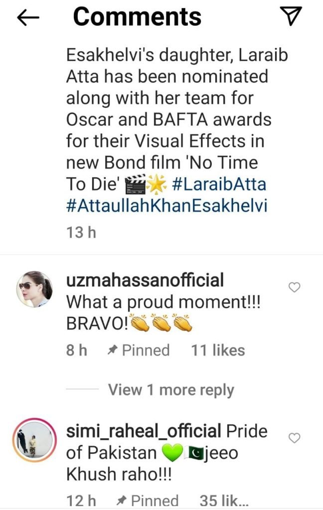 Laraib Atta, a young visual artist and the daughter of musician Attaullah Esakhelvi, made the nation proud after her team landed Oscar and BAFTA nominations for their work on James Bond film No Time to Die.