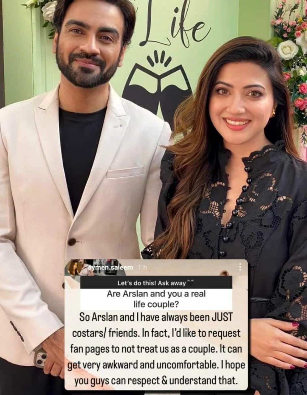Actor Aymen Saleem who was last seen in Paristan on HUM TV has cleared the air regarding her relationship with co-star and friend Arslan Naseer.