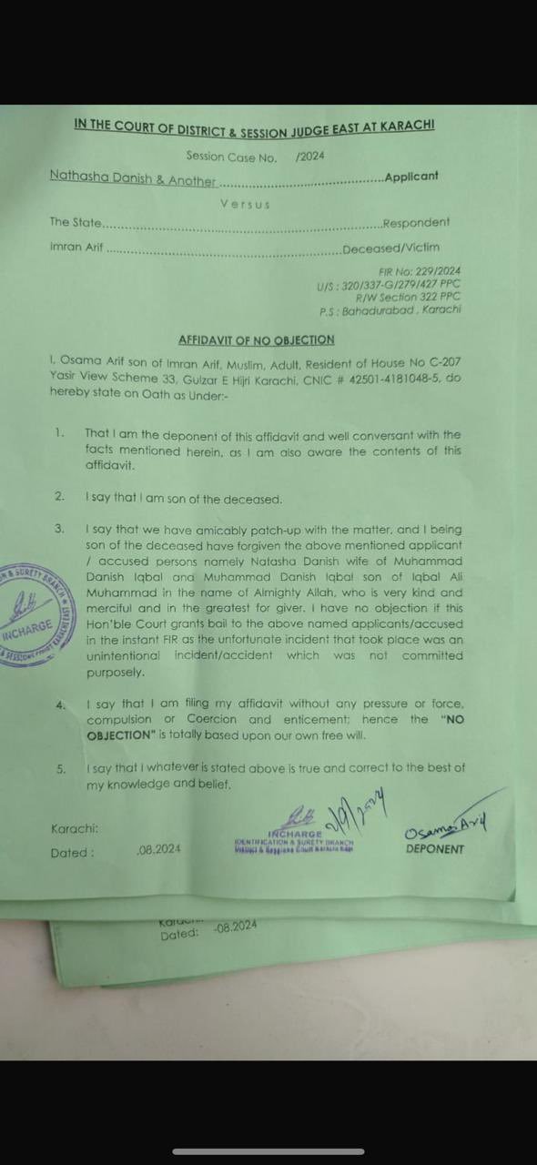 Geo reported on Friday morning that the family of deceased Imran Arif and Amna Arif have prepared affidavits that will be presented today in today’s hearing of Natasha’s bail application.