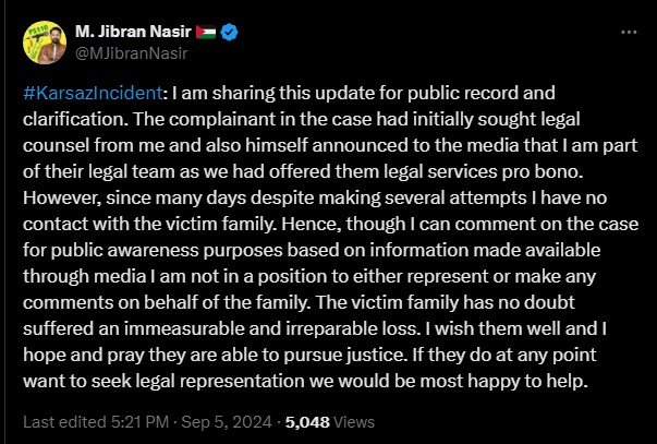 The lawyer for the victims in the Karsaz case, Barrister Aziz Ghouri has denied the claims that diyat (blood money) was paid to the family, saying that the suspect was pardoned “in the name of Allah”, as per Dawn News.