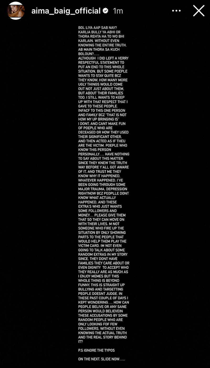 “Whatever happened, I’ve been going through some major trauma, depression right now because people don’t know what actually happened. And these extras who just want some followers and money…please give them that so they can move on with their lives,” she said, referring to an account that made claims about Baig’s relationship. “I’m not someone who fire up the situation by only showing parts to the people that would help them play the victim card. I’m not even going to talk about some random extras in my story since they don’t have families they care about or even dignity to accept who they really are as much as I enjoy memes but this whole thing is beyond funny.”