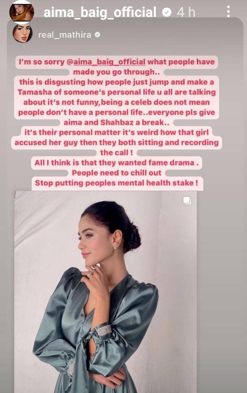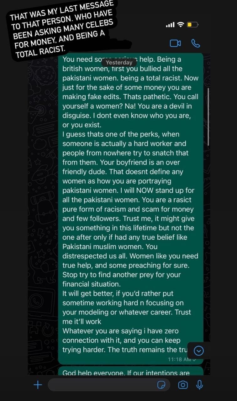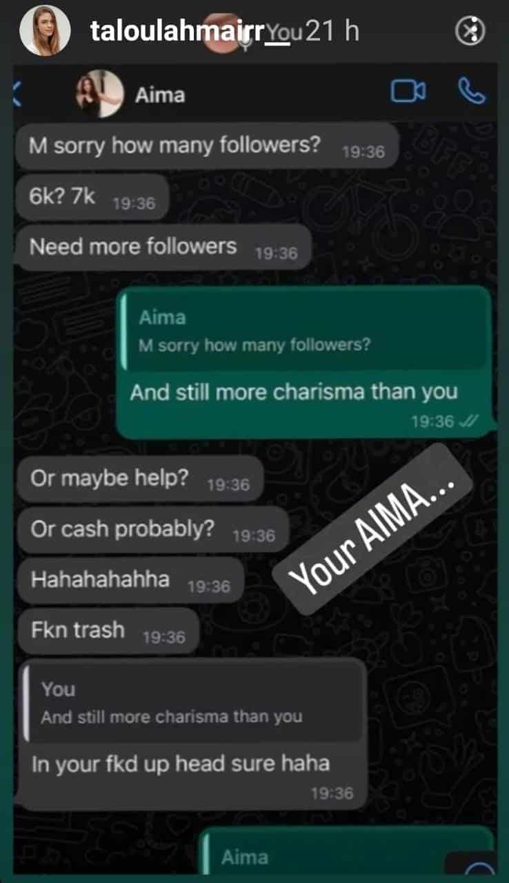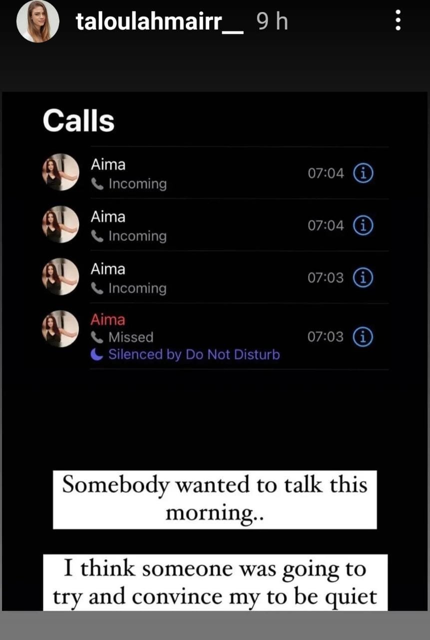 Mair shared a screenshot, showing that Baig called her four times on WhatsApp. According to Taloulah, Aima wanted to convince her to not reveal more details.