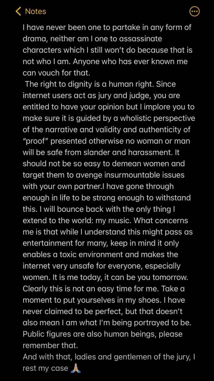 “I don’t and can’t make fun of people who are deceased or how they used their significant other and then acted as if they are the victim. People who know this person personally… have nothing to say about this matter since they knew the truth way before y’all got aware of it. And trust me they know why it happened,” wrote the singer.