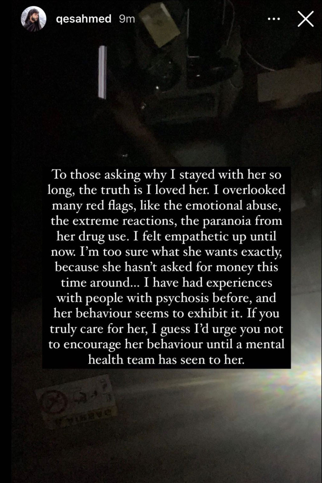In another Instagram story, Ahmed wrote, “To those asking why I stayed with her [Mair] for so long, the truth is I loved her. I overlooked many red flags, like the emotional abuse, the extreme reactions, and the paranoia from her drug use. I felt empathetic up until now. I’m too sure what she wants exactly because she hasn’t asked for money this time around. I have had experiences with people with psychosis before and her behaviour seems to exhibit it. If you truly care for her, I guess I’d urge you to not encourage her behaviour until a mental health team has seen to her.”