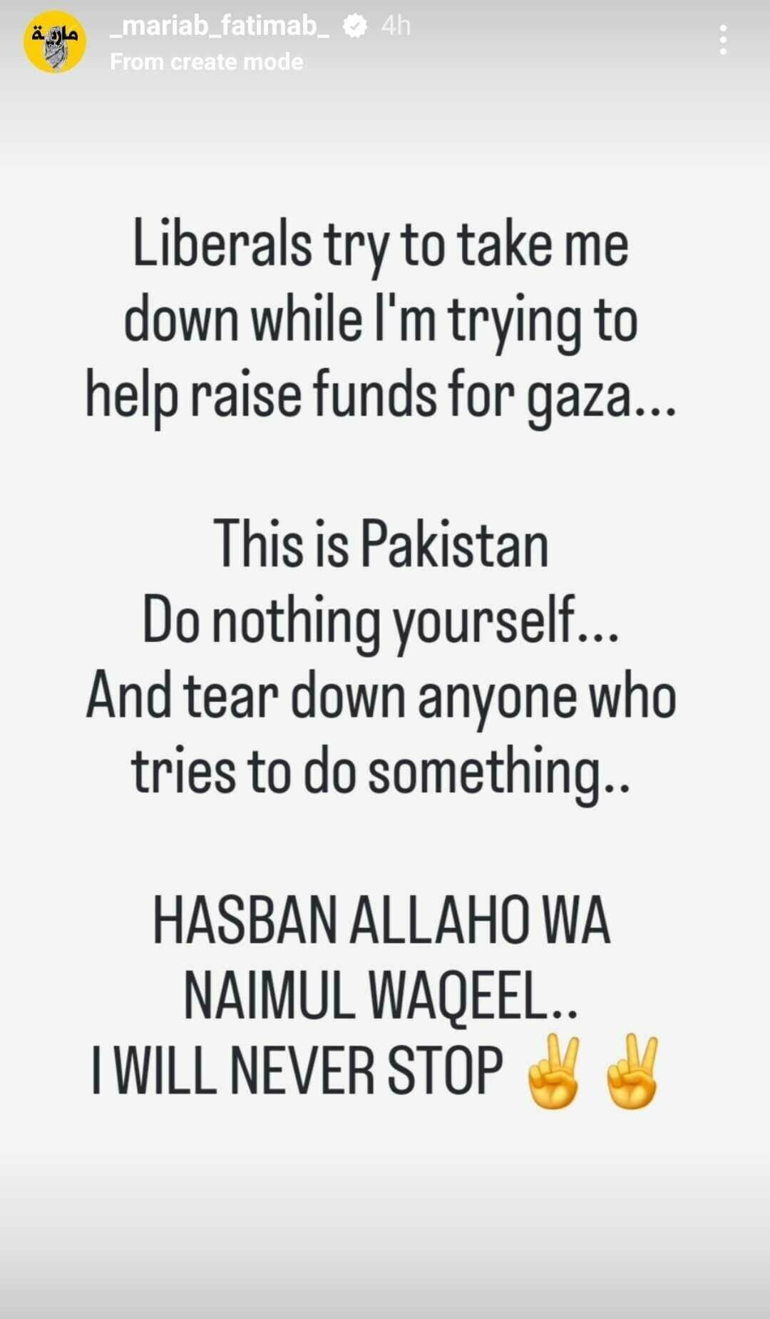 She emphasised, “This is an inspired collection picking up images of resistance,” and clarified that she was not making any money from the sales. “Liberals try to take me down while I’m trying to help raise funds for Gaza. This is Pakistan. Do nothing yourself and tear down anyone who tries to do something, God is enough for me, I will never stop,” she added.