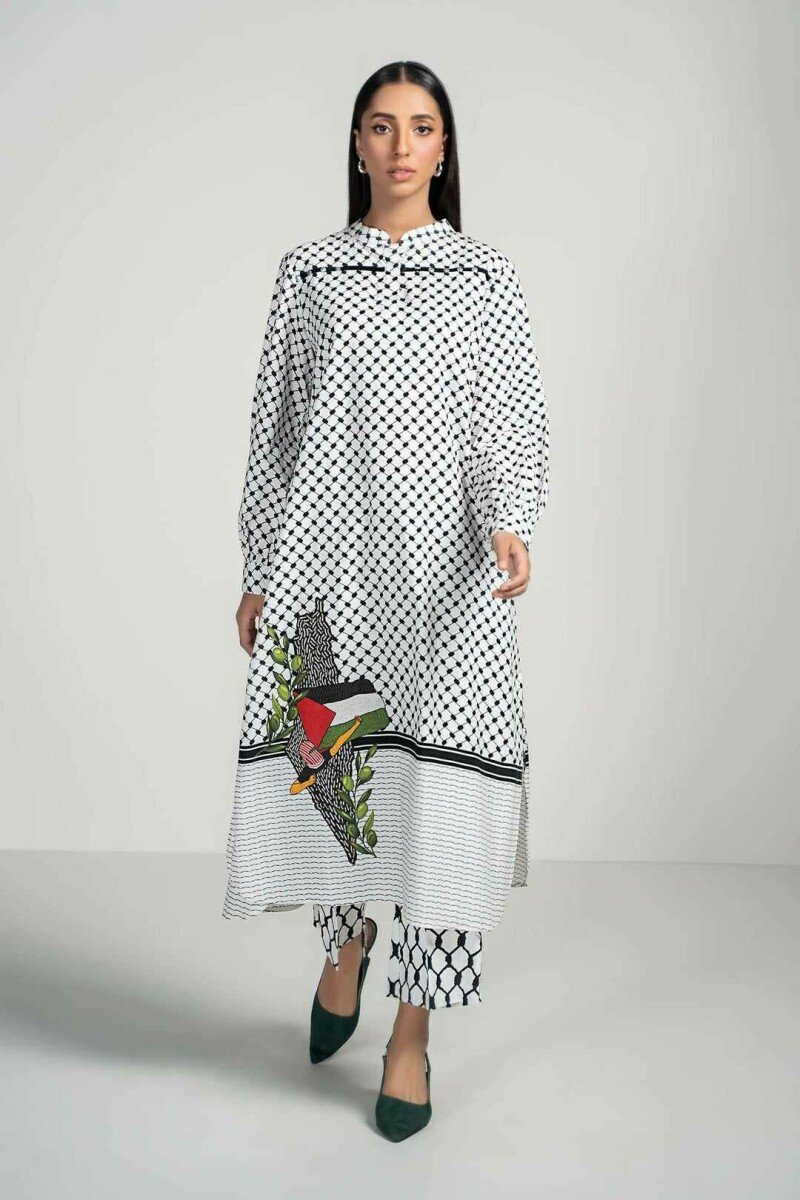 Over the weekend, designer Maria B. launched a capsule line called the Falesteen Collection. The collection includes T-shirts, two-piece and three-piece lawn suits featuring prints of the black-and-white keffiyeh, colourful houndstooth patterns, and watermelon, symbolising Palestine’s resistance.