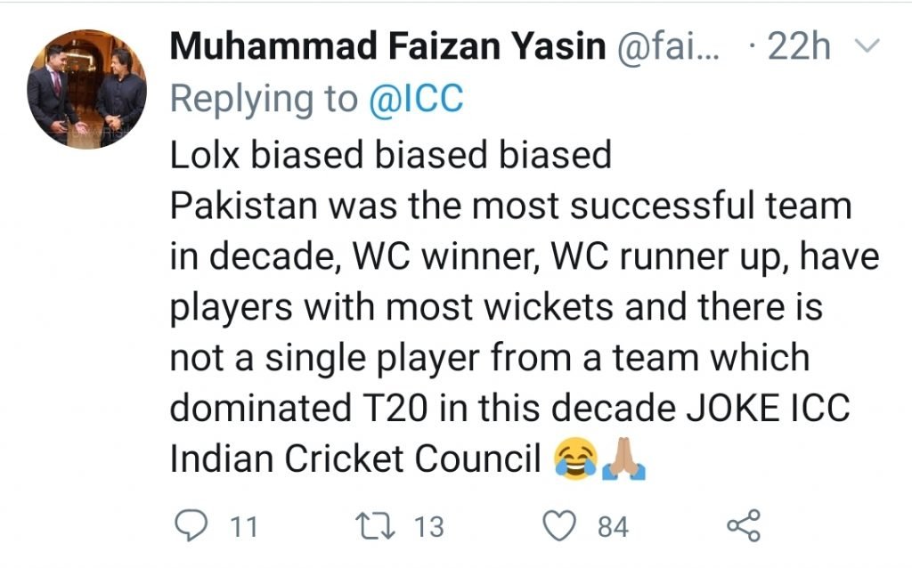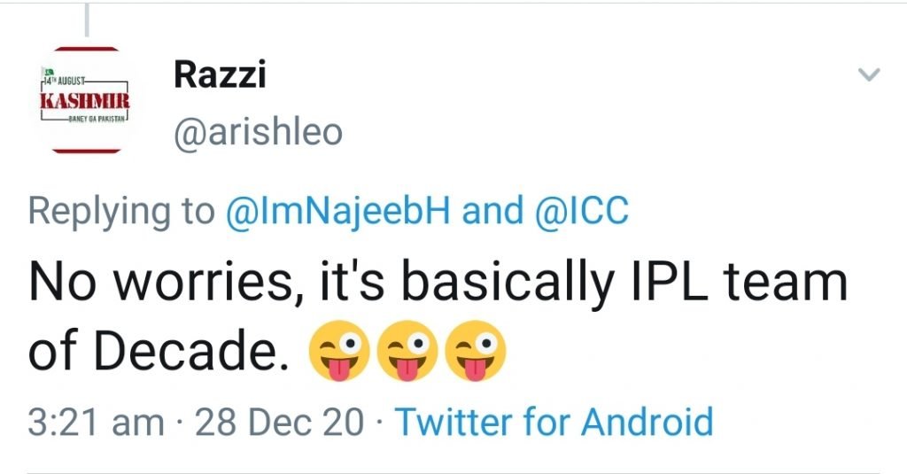 Islamabad main itni sardi hai kay @ICC ki Teams of dDecade dekh kar mera ghussa bhee freeze ho gia! Phir aik dost nay bataya k ye awards merit per nahi voting per diyey jaatay hain or India ki abadi hum sai bohat ziyada hai! ♀️So keep supporting ur players.