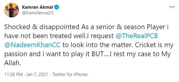 Taking to Twitter, Akmal expressed his feelings and wrote: “Shocked and disappointed. As a senior and season[ed] player, I have not been treated well.”