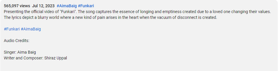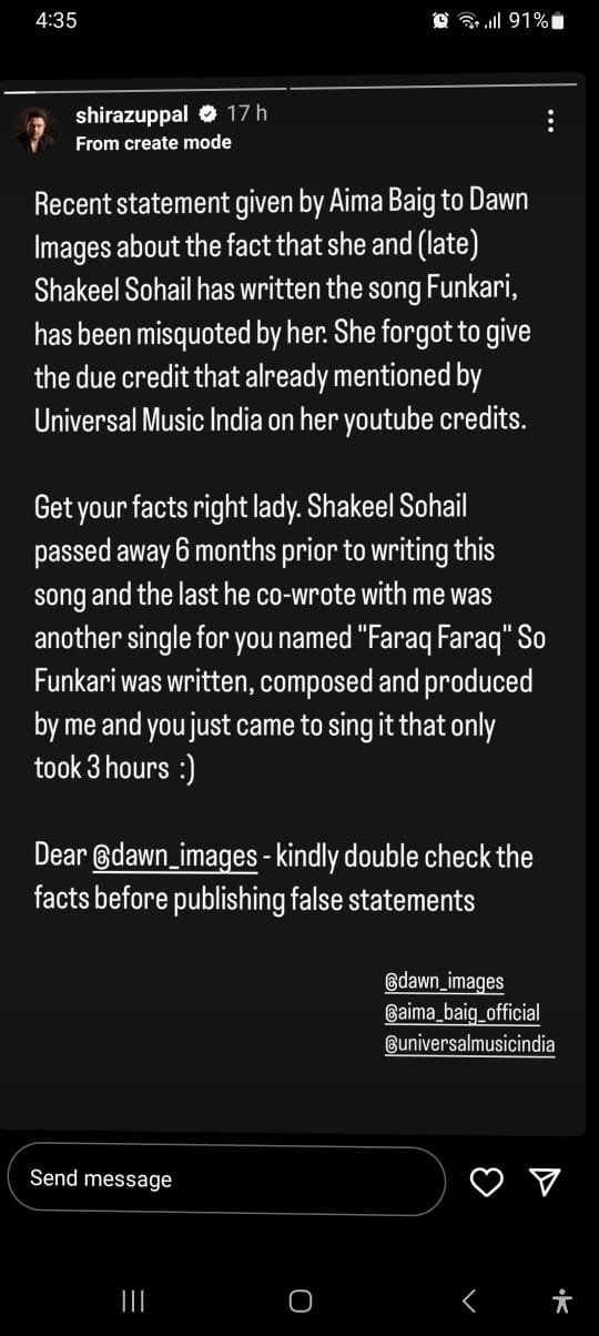 “Recent statement given by Aima Baig to Dawn Images about the fact that she and (late) Shakeel Sohial has written a song Funkari, has been misquoted by her. She forgot to give due credit that already mentioned by Universal Music India in her youtube credits.”