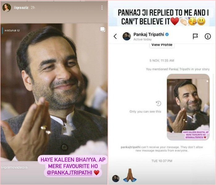 Taking to her Instagram stories on November 5, Aziz shared a picture of Pankaj Tripathi and wrote, “Hayee Kaleen bhaiya ap mere favourite ho (Oh Kaleen, you are my favourite).”