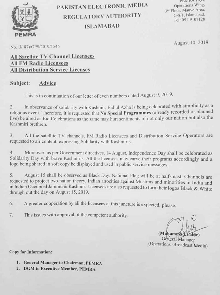 PEMRA told media outlets that August 14 will also be observed in “solidarity day with brave Kashmiris”.